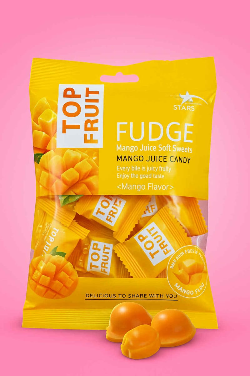 Сочно изкушение в свежа опаковка! Top Fruit Fudge е вкусно мека карамелена хапка, съчетала естествената сладост на манго. Всеки бонбон е обвит в индивидуално фолио и предлага идеалния баланс между плодова свежест и млечна мекота.