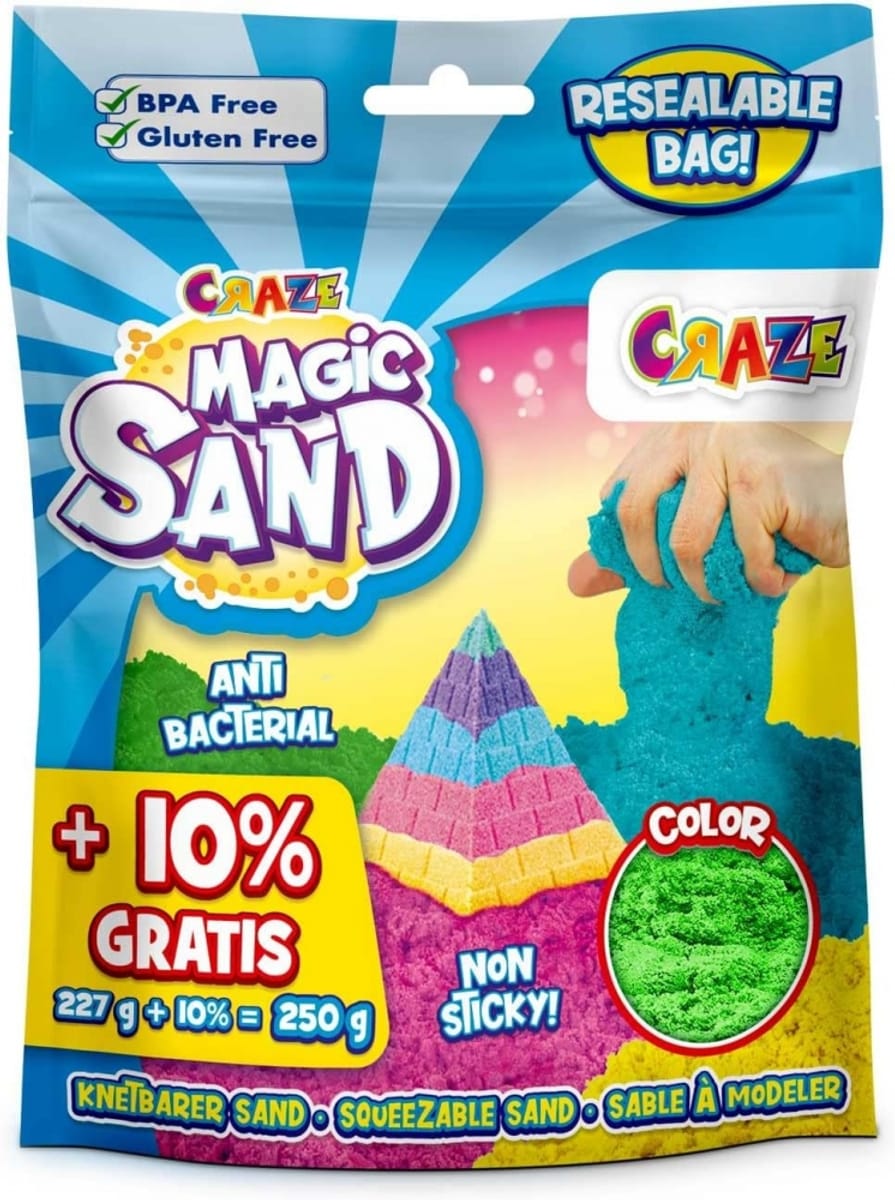 Комплектът от Craze ще донесе на всички малчугани часове истинско забавление. Магическия пясък е мек и много приятен на допир. Съдържа приблизително. 250гр MAGIC SAND в торбичка, предлага в 4 страхотни цвята (тюркоаз, розов, жълт, зелен).